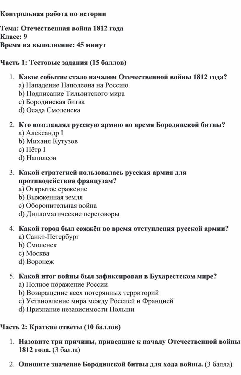 1. Назовите три причины, приведшие к началу Отечественной войны 1812 года. (3 балла)