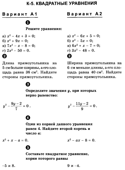 КОНТРОЛЬНАЯ РАБОТА ПО АЛГЕБРЕ 8 КЛАСС "КВАДРАТНЫЕ УРАВНЕНИЯ"