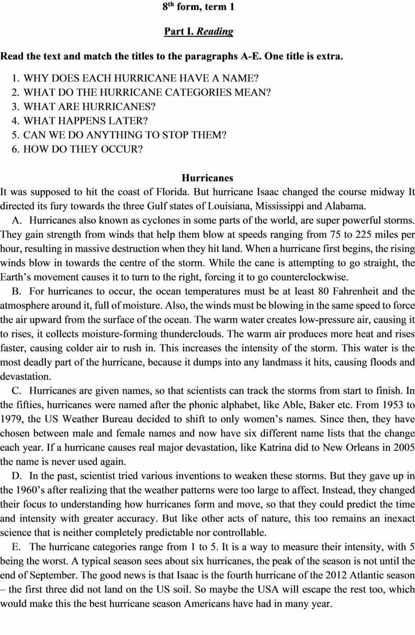 Задание 1 (чтение) - предлагает учащимся найти верное заглавие к каждому абзацу (5 баллов).