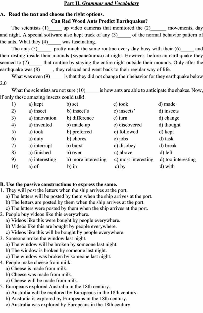 The ants (5)_____ pretty much the same routine every day busy with their (6)_____ and then resting inside their mounds (муравейники) at night. However, before an earthquake they seemed to (7)_____ that routine by staying the entire night outside their mounds. Only after the earthquake was (8)_____, they relaxed and went back to their regular way of life.