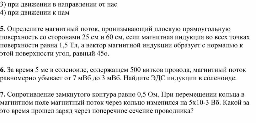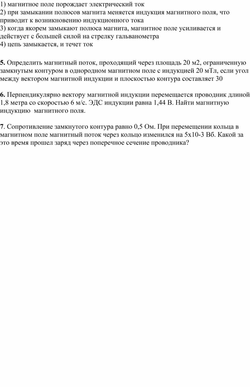 5. Определить магнитный поток, проходящий через площадь 20 м2, ограниченную замкнутым контуром в однородном магнитном поле с индукцией 20 мТл, если угол между вектором магнитной индукции и плоскостью контура составляет 30