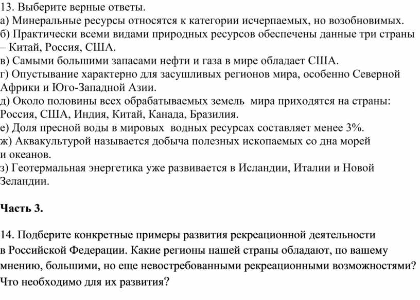 14. Подберите конкретные примеры развития рекреационной деятельности в Российской Федерации. Какие регионы нашей страны обладают, по вашему мнению, большими, но еще невостребованными рекреационными возможностями? Что необходимо для их развития?