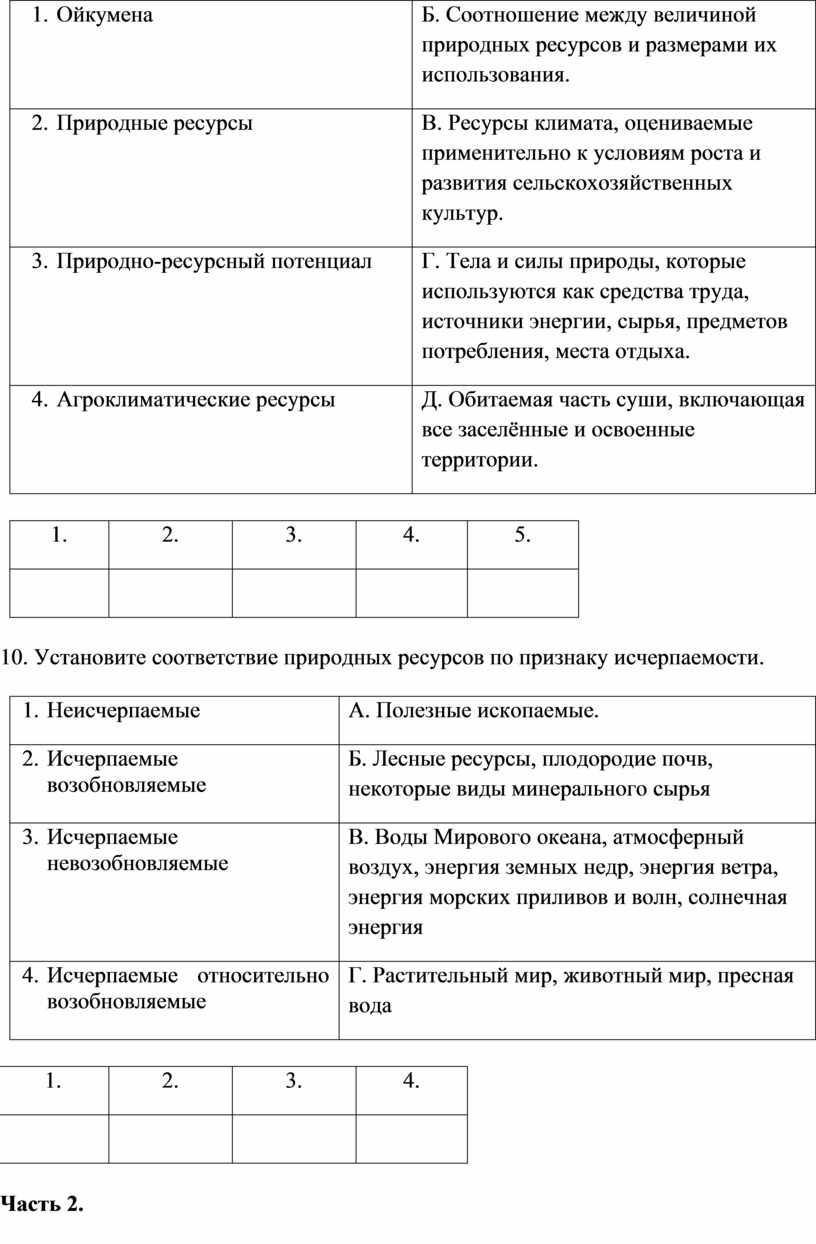 10. Установите соответствие природных ресурсов по признаку исчерпаемости.