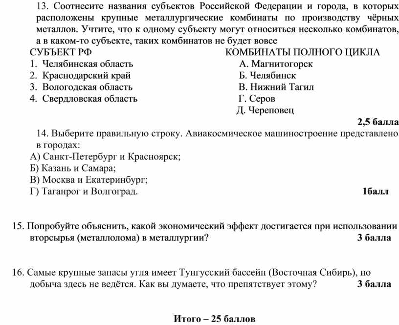 13. Соотнесите названия субъектов Российской Федерации и города, в которых расположены крупные металлургические комбинаты по производству чёрных металлов. Учтите, что к одному субъекту могут относиться несколько комбинатов, а в каком-то субъекте, таких комбинатов не будет вовсе