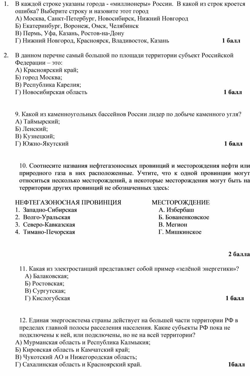 Г) Нижний Новгород, Красноярск, Владивосток, Казань 1 балл