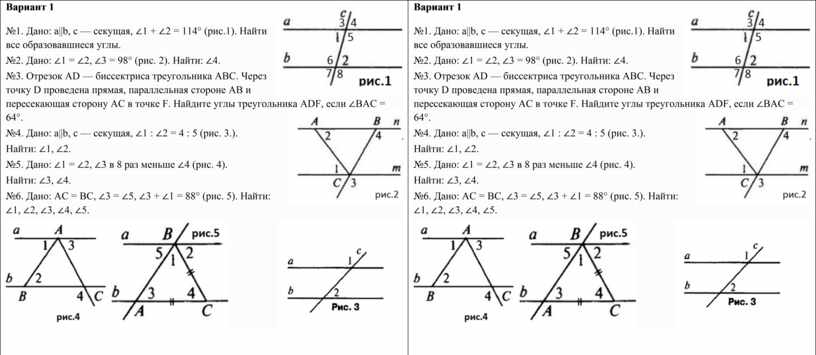 №1. Дано: а||b, с — секущая, ∠1 + ∠2 = 114° (рис.1). Найти все образовавшиеся углы. №2. Дано: ∠1 = ∠2, ∠3 = 98° (рис. 2). Найти: ∠4.