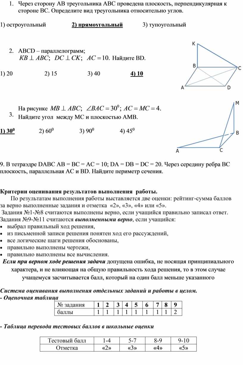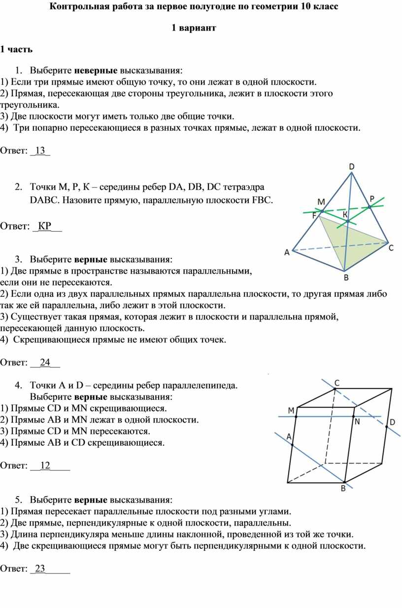 Контрольная работа за первое полугодие по геометрии 10 класс