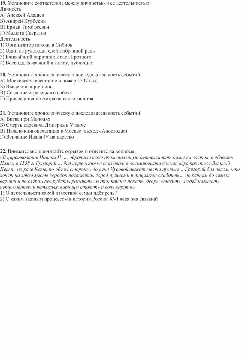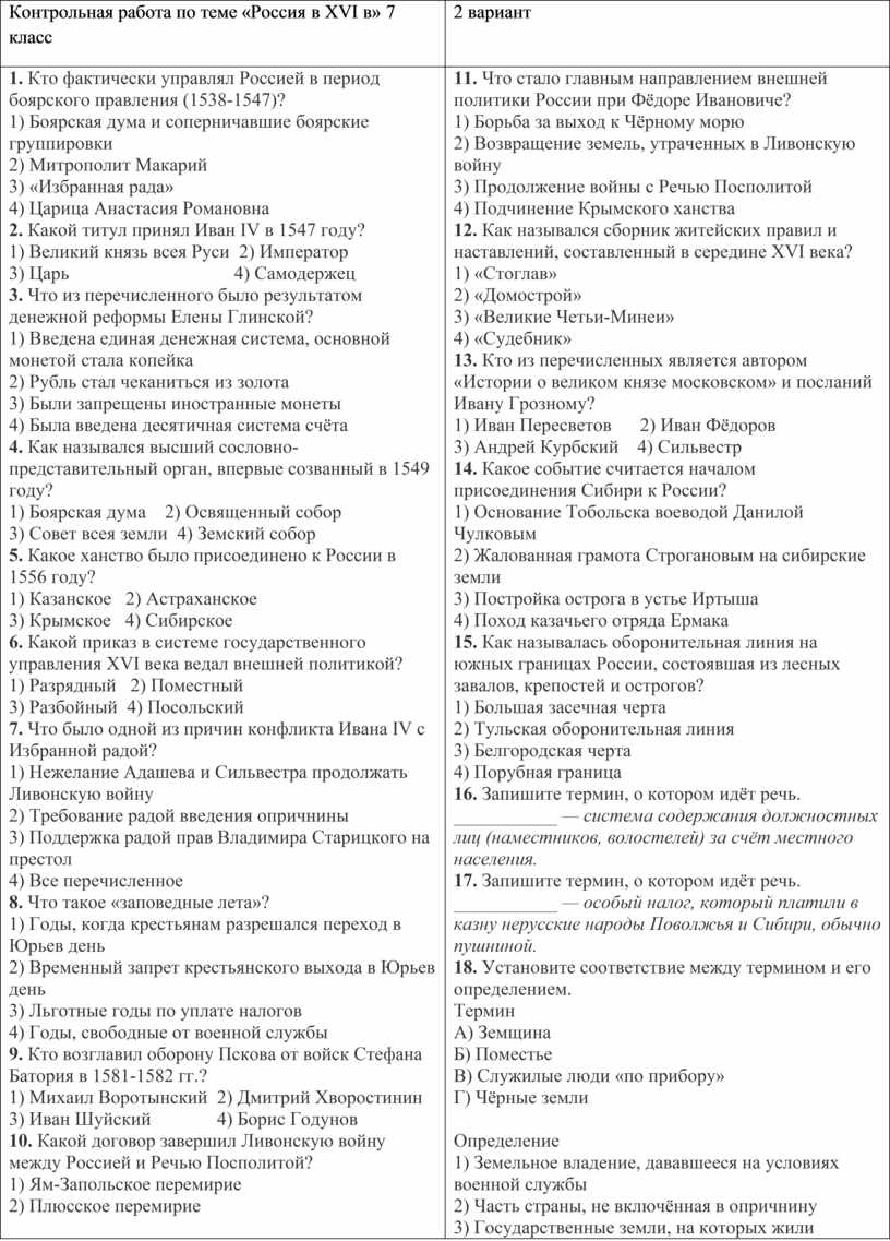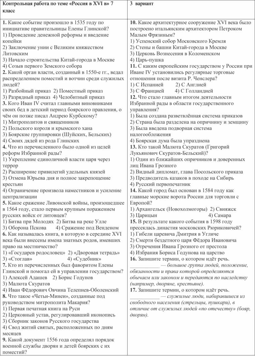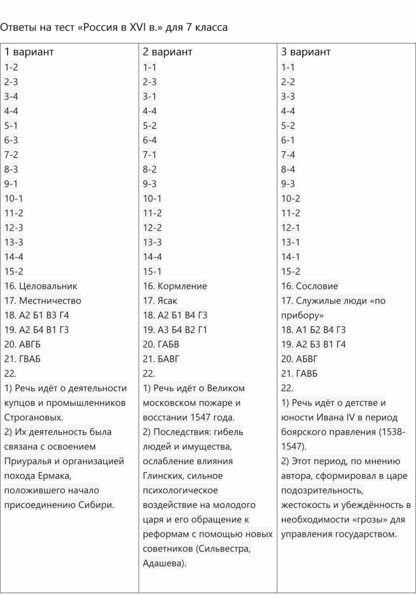 Ответы на тест «Россия в XVI в.» для 7 класса