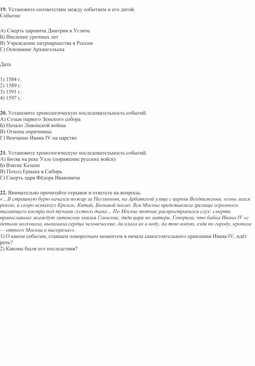 Фёдор Конь 16. Запишите термин, о котором идёт речь. ___________ — выборный представитель местного населения, помогавший в суде губному старосте и целовавший крест на верность (дававший клятву). 17. Запишите термин, о котором идёт речь. ___________ — порядок назначения на государственные и военные должности в зависимости от знатности рода и служебного положения предков. 18. Установите соответствие между событием и датой. Событие А) Начало регентства Елены Глинской Дата 1) 1550 г. 2) 1533 г. 3) 1583 г. 4) 1584 г.