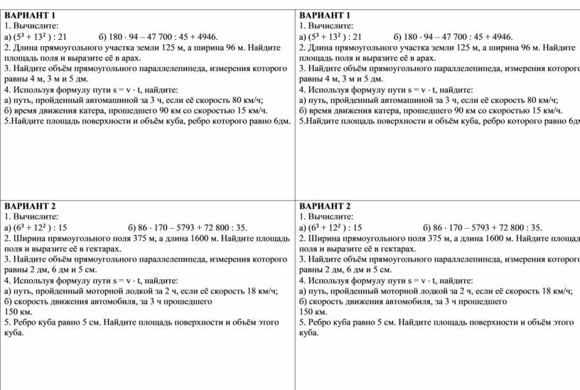 ВАРИАНТ 2 1. Вычислите: а) (63 + 122 ) : 15 б) 86 × 170 – 5793 + 72 800 : 35. 2. Ширина прямоугольного поля 375 м, а длина 1600 м. Найдите площадь поля и выразите её в гектарах. 3. Найдите объём прямоугольного параллелепипеда, измерения которого равны 2 дм, 6 дм и 5 см. 4. Используя формулу пути s = v × t, найдите: а) путь, пройденный моторной лодкой за 2 ч, если её скорость 18 км/ч; б) скорость движения автомобиля, за 3 ч прошедшего 5. Ребро куба равно 5 см. Найдите площадь поверхности и объём этого куба. |