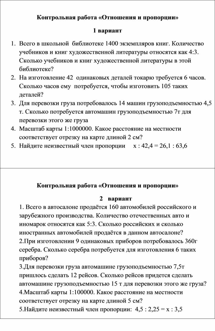 Контрольная работа «Отношения и пропорции» 1 вариант 1. Всего в школьной библиотеке 1400 экземпляров книг. Количество учебников и книг художественной литературы относятся как 4:3. Сколько учебников и книг художественной литературы в этой библиотеке? 2. На изготовление 42 одинаковых деталей токарю требуется 6 часов. Сколько часов ему потребуется, чтобы изготовить 105 таких деталей? 3. Для перевозки груза потребовалось 14 машин грузоподъемностью 4,5 т. Сколько потребуется автомашин грузоподъемностью 7т для перевозки этого же груза 4. Масштаб карты 1:1000000. Какое расстояние на местности соответствует отрезку на карте длиной 2 см? 5. Найдите неизвестный член пропорции х : 42,4 = 26,1 : 63,6