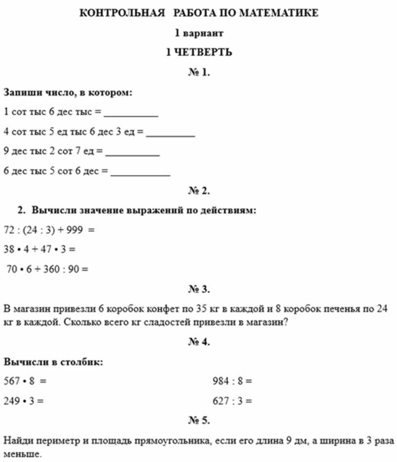 Контрольная работа по математике по программе "УМК Школа России" 4 класс 1 четверть