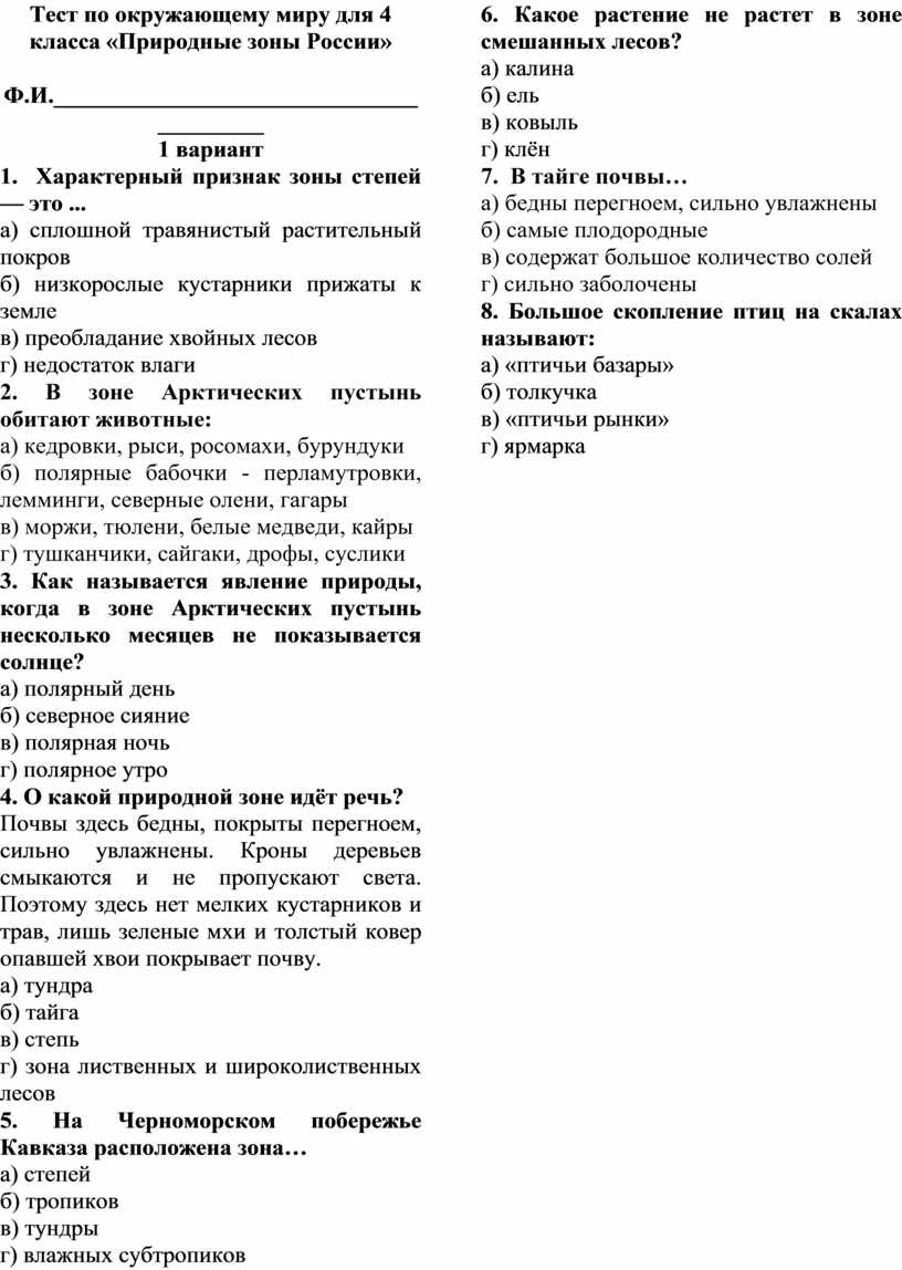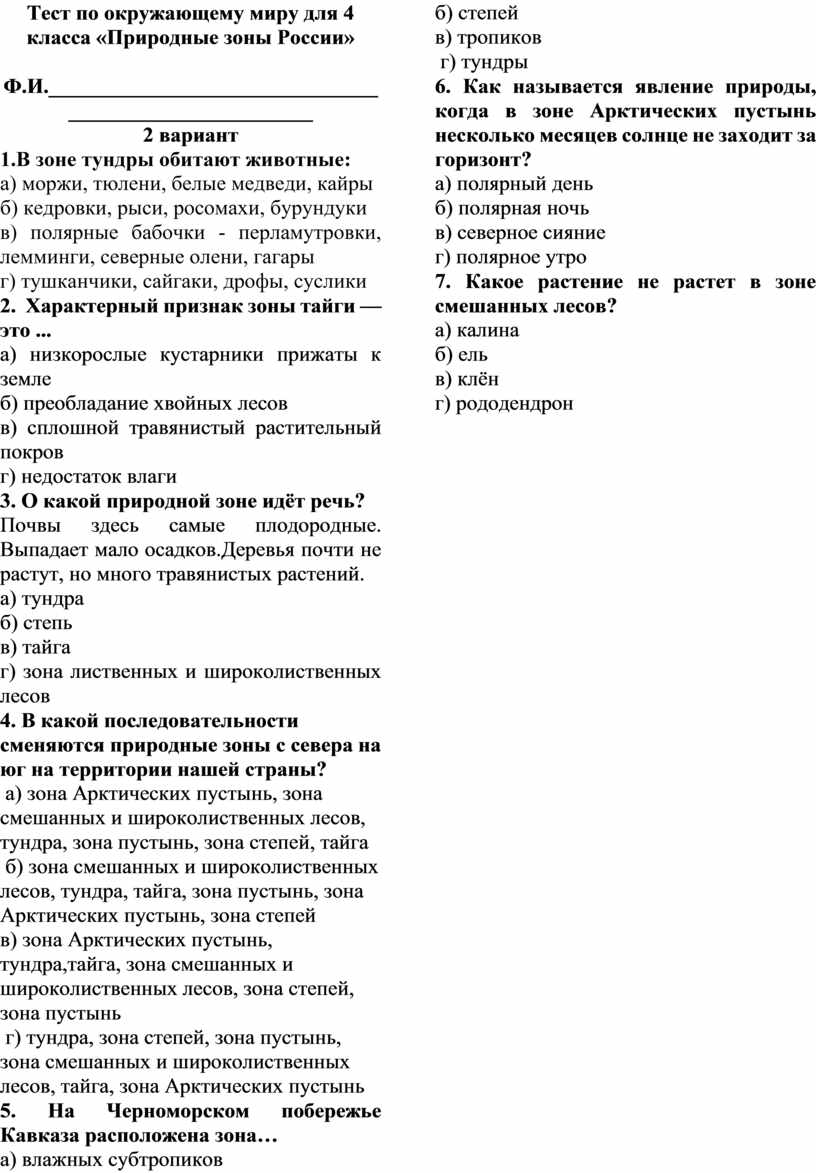 Тест по окружающему миру для 4 класса «Природные зоны России»