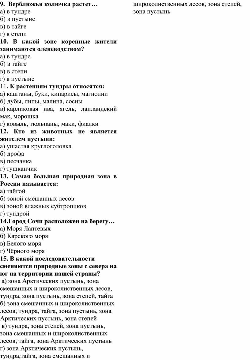а) зона Арктических пустынь, зона смешанных и широколиственных лесов, тундра, зона пустынь, зона степей, тайга