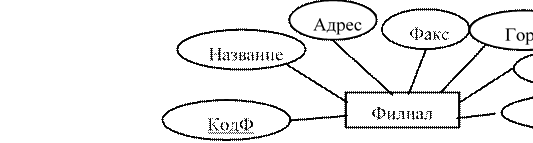 Атрибуты: КодФ код данного филиала; Название название данного филиала; Адрес адрес данного филиала; Факс факс данного филиала; Город город, где находится данный филиал; Телефон телефон данного филиала; ФИО директора фамилия, имя, отчество директора данного филиала.