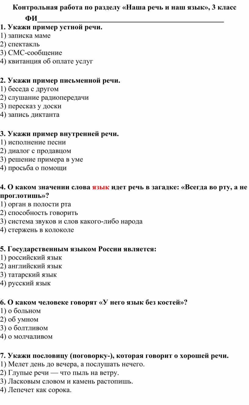 Контрольная работа по разделу «Наша речь и наш язык», 3 класс