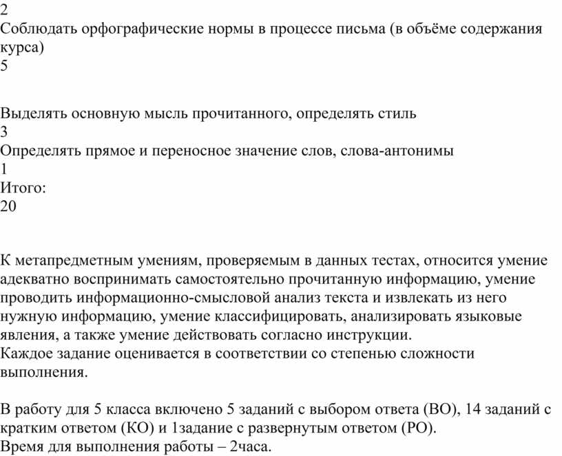 Диагностическая работа сориентирована на содержание, включенное в основные учебно-методические комплекты по русскому языку, используемые в 5-х классах, и составлена на основе требований к метапредметным и предметным результатам обучения ФГОС ООО.