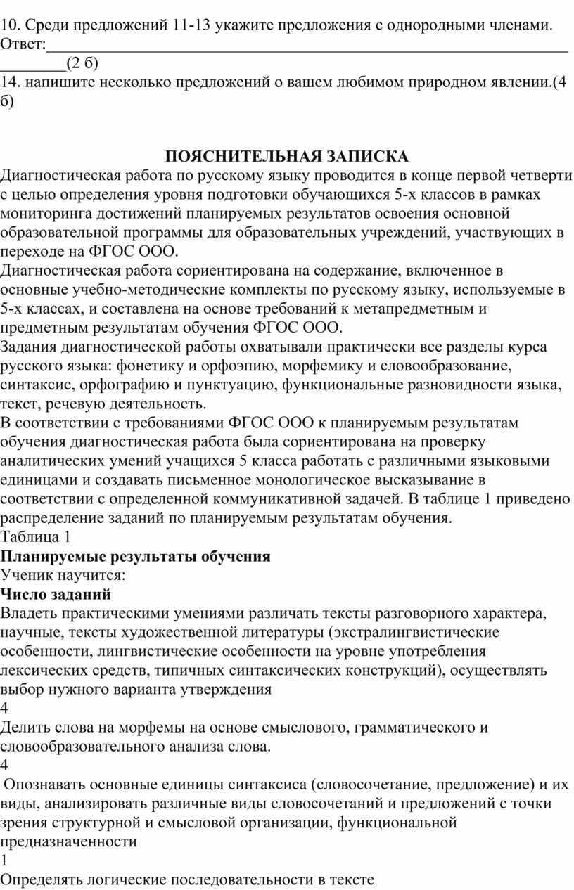 В соответствии с требованиями ФГОС ООО к планируемым результатам обучения диагностическая работа была сориентирована на проверку аналитических умений учащихся 5 класса работать с различными языковыми единицами и создавать письменное монологическое высказывание в соответствии с определенной коммуникативной задачей. В таблице 1 приведено распределение заданий по планируемым результатам обучения.