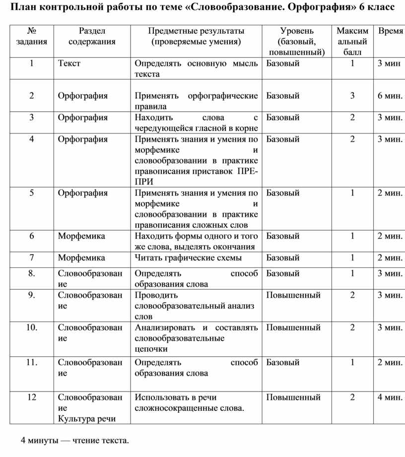 План контрольной работы по теме «Словообразование. Орфография» 6 класс