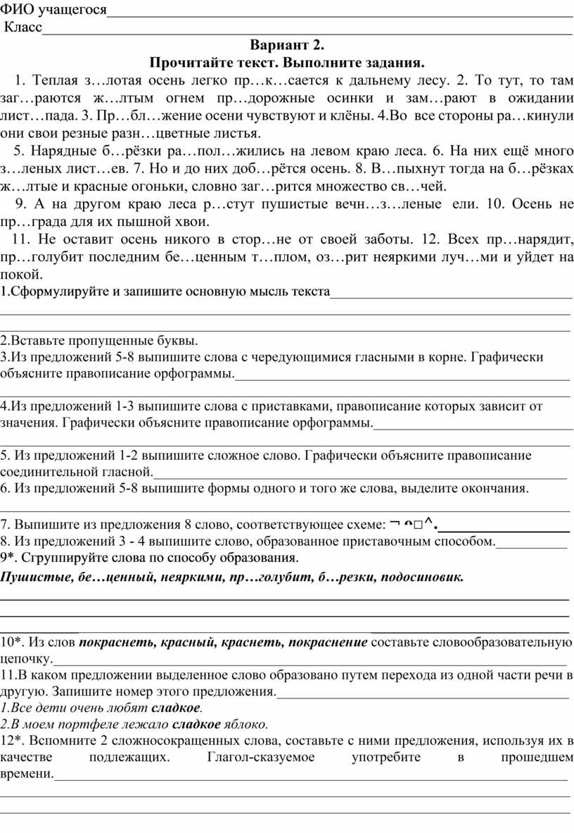 Контрольная работа по теме «Словообразование. Орфография» 6 класс
