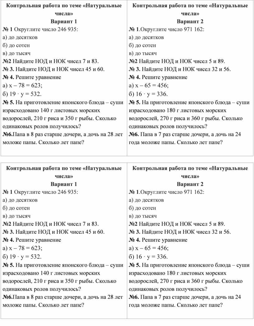 Контрольная работа по теме «Натуральные числа» Вариант 1 № 1 Округлите число 246 935: а) до десятков б) до сотен в) до тысяч №2 Найдите НОД и НОК чисел 7 и 83. № 3. Найдите НОД и НОК чисел 45 и 60. № 4. Решите уравнение а) х – 78 = 623; б) 19 · у = 532. № 5. На приготовление японского блюда – суши израсходовано 140 г листовых морских водорослей, 210 г риса и 350 г рыбы. Сколько одинаковых ролов получилось? №6.Папа в 8 раз старше дочери, а дочь на 28 лет моложе папы. Сколько лет папе?