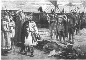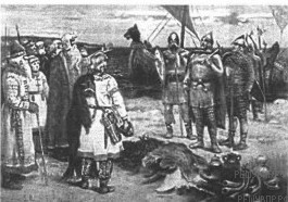 «В год 6370 (862) изгнали варягов за море, и не дали им дани, и начали сами собой владеть, и не было среди них правды, и встал род на род, и была у них усобица, и стали воевать друг с другом. И сказали себе: « Поищем себе князя, который бы владел нами и судил по праву». И пошли за море к варягам, к руси... Сказали руси чудь, словене, кривичи и весь: «Земля наша велика и обильна, а порядка в ней нет. Приходите княжить и владеть нами». И избрались трое братьев со своими родами, и взяли с собой всю русь, и пришли, и сел старший, Рюрик, в Новгороде, а другой, Синеус, — на Белоозере, а третий, Трувор — в Изборске. И от тех варягов прозвалась Русская земля».