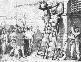 «И… узнал Олег, что княжат тут Аскольд и Дир. Спрятал он одних воинов в ладьях, а других оставил позади, и сам приступил, неся младенца Игоря. И подплыл к Угорской горе, спрятав своих воинов, и послал к Аскольду и Диру, говоря им, что-де «мы купцы, идём в Греки от Олега и княжича Игоря. Придите к нам, к родичам своим». Когда же Аскольд и Дир пришли, выскочили все остальные из ладей, и сказал Олег Аскольду и Диру: «Не князья вы и не княжеского рода, но я княжеского рода», и показал Игоря: «А это сын Рюрика». И убили Аскольда и Дира, отнесли на гору и погребли Аскольда на горе, которая называется ныне Угорской, где теперь Ольмин двор; на той могиле Ольма поставил церковь святого Николы; а Дирова могила — за церковью святой Ирины».