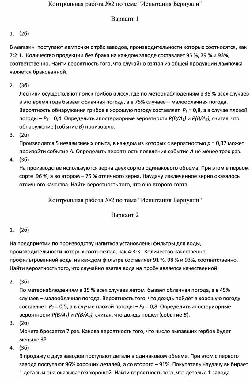 Контрольная работа №2 по теме "Испытания Бернулли"