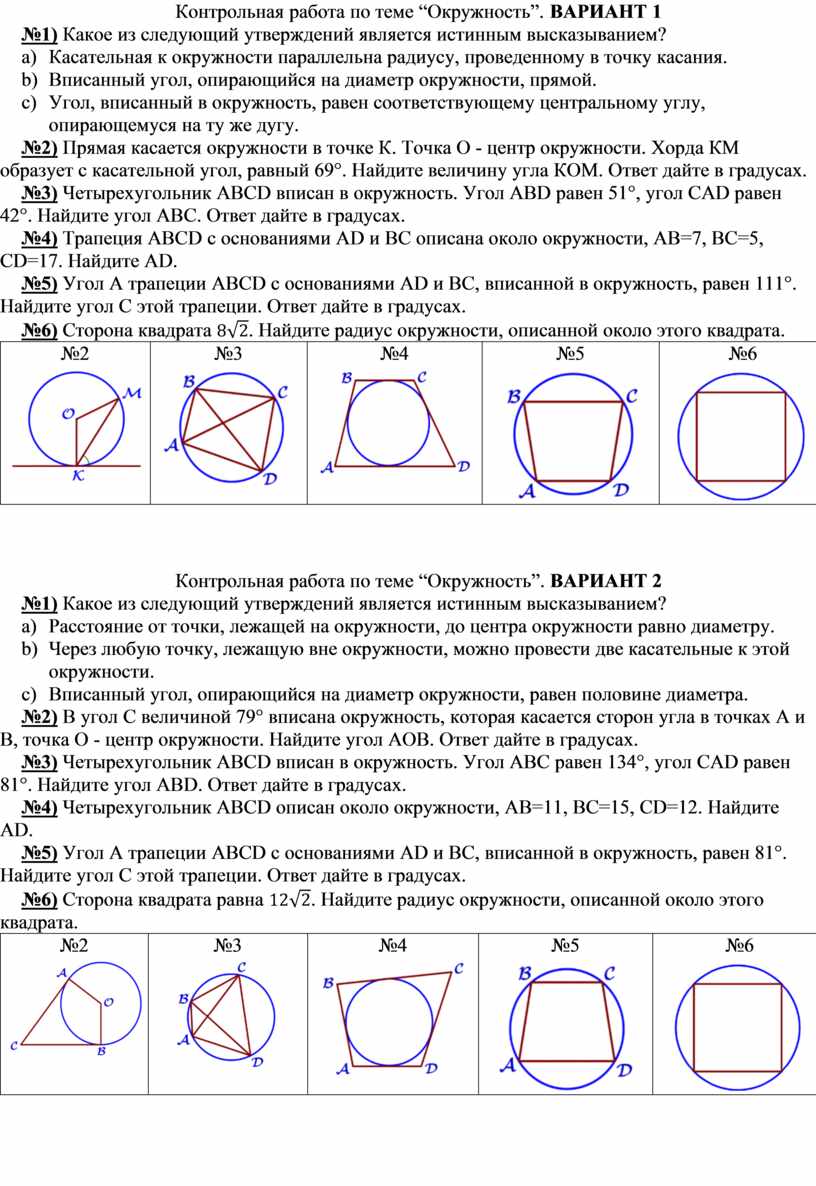 Контрольная работа по теме “Окружность”. ВАРИАНТ 2