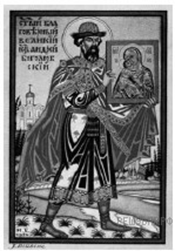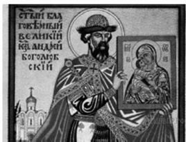 «Князь принял мученическую кончину от руки изменников в своём замке. Он был убит по наущению его жены, участвовавшей в заговоре. Во главе заговора стояли её братья, Кучковичи. Толпа убийц, двадцать человек, пробралась к дворцу, перебила малочисленную охрану и вломилась в опочивальню безоружного князя. Меч святого Бориса, постоянно висевший над его постелью, был предательски похищен в ту ночь ключником Анбалом. Князь успел повергнуть на пол первого из нападавших, которого сообщники тут же по ошибке пронзили мечами. Но вскоре они поняли свою ошибку…».