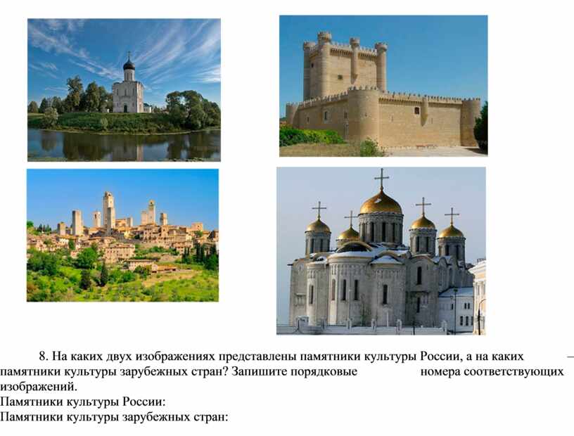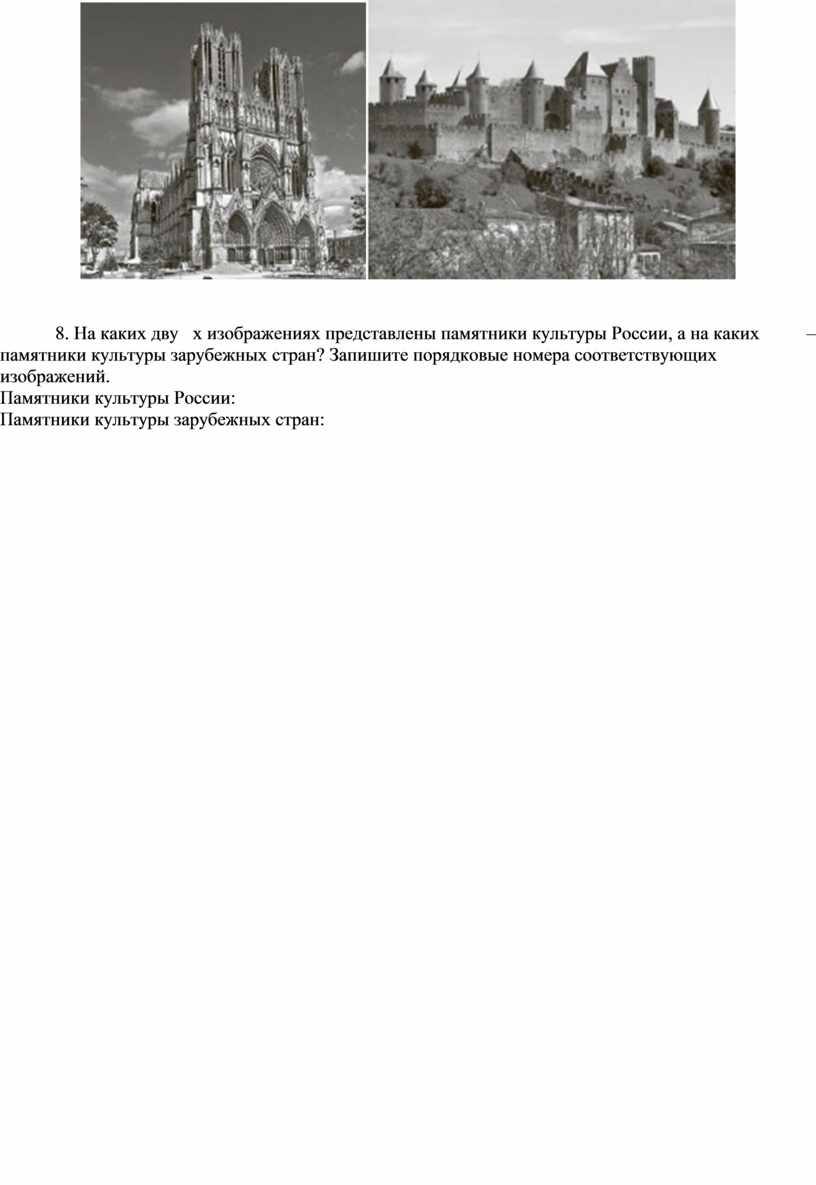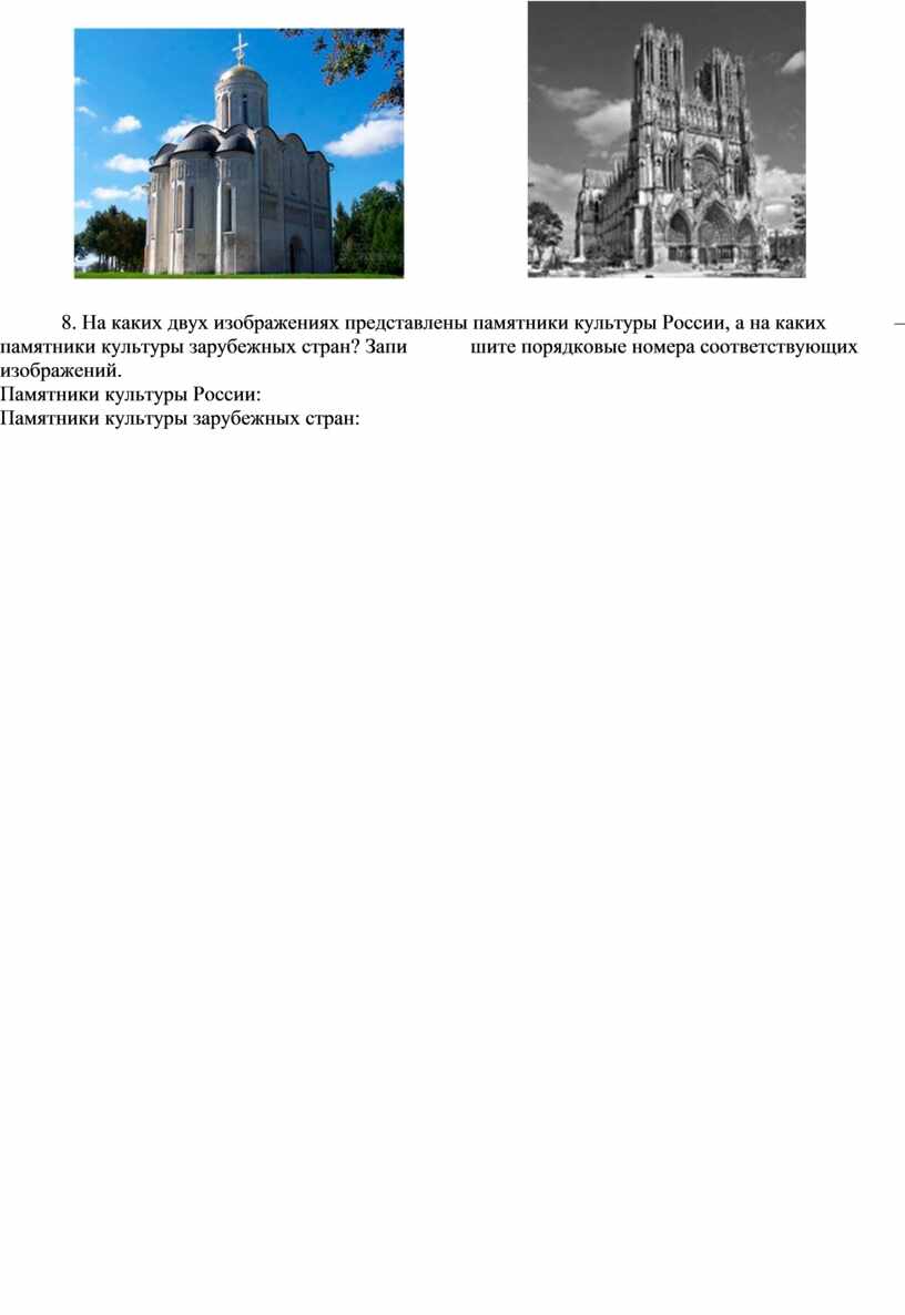 8. На каких двух изображениях представлены памятники культуры России, а на каких – памятники культуры зарубежных стран? Запишите порядковые номера соответствующих изображений.