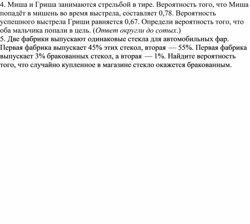 4. Миша и Гриша занимаются стрельбой в тире. Вероятность того, что Миша попадёт в мишень во время выстрела, составляет 0,78. Вероятность успешного выстрела Гриши равняется 0,67. Определи вероятность того, что оба мальчика попали в цель. (Ответ округли до сотых.)