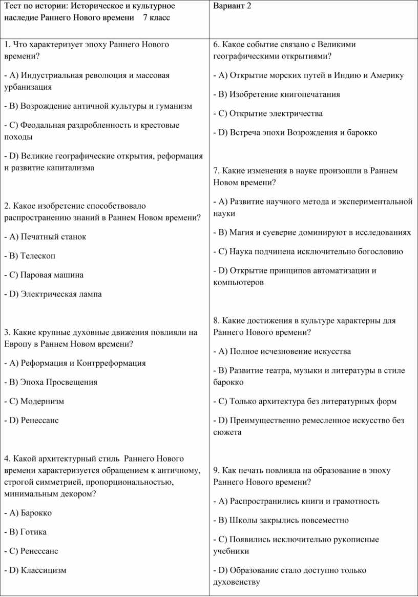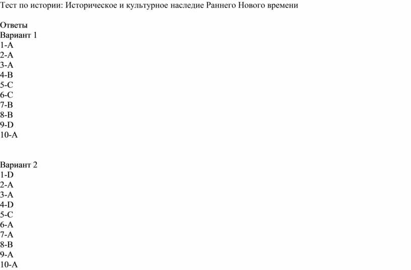 Тест по истории: Историческое и культурное наследие Раннего Нового времени