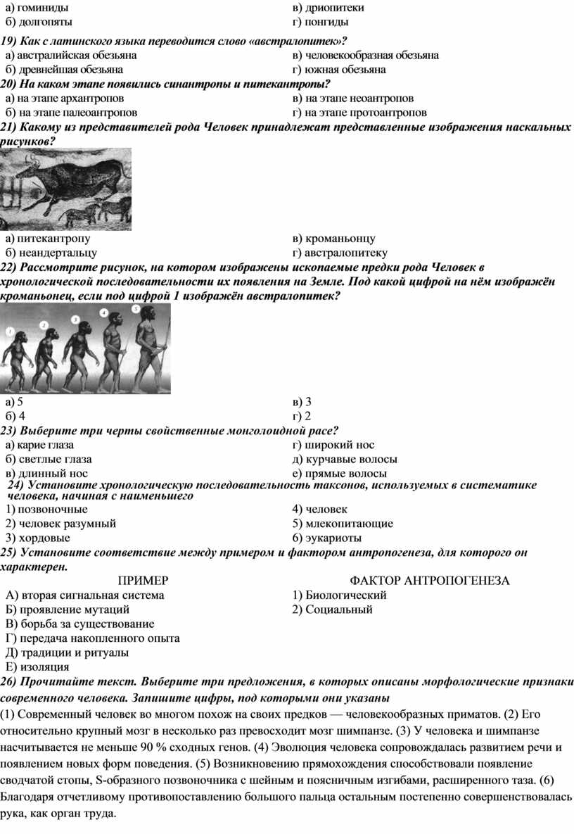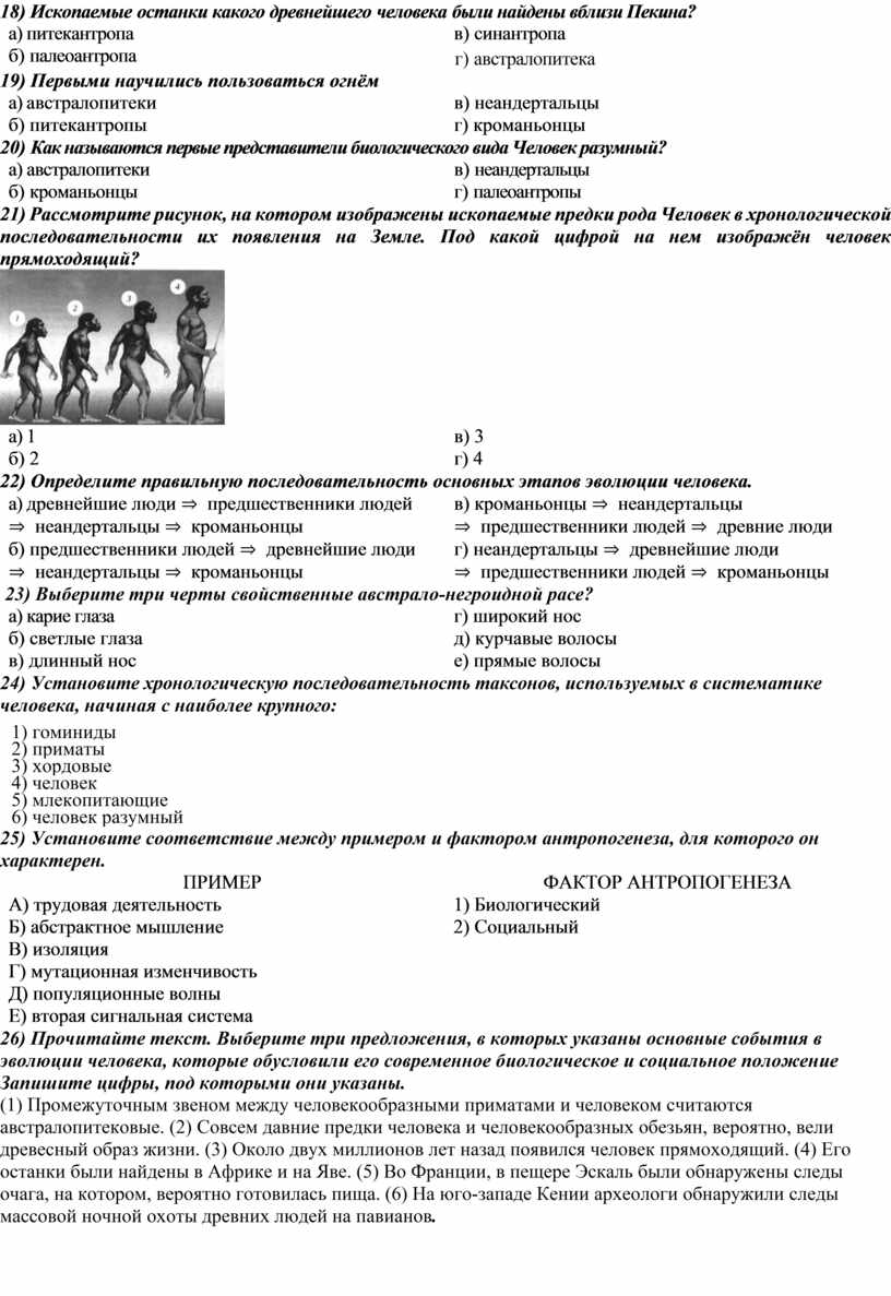 26) Прочитайте текст. Выберите три предложения, в которых указаны основные события в эволюции человека, которые обусловили его современное биологическое и социальное положение Запишите цифры, под которыми они указаны.