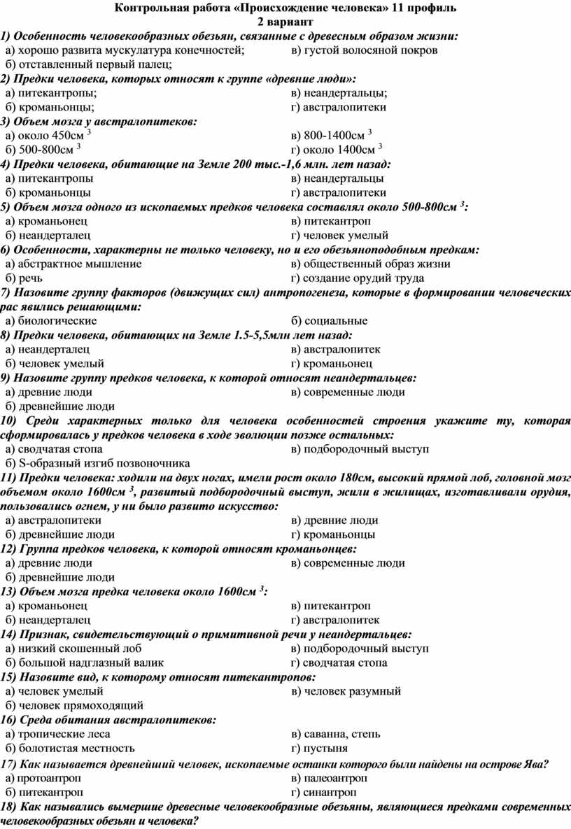 Контрольная работа «Происхождение человека» 11 профиль