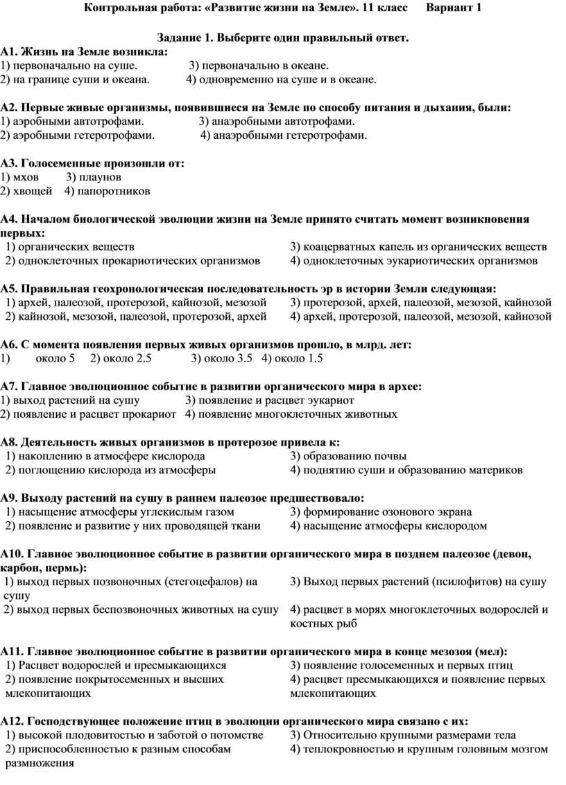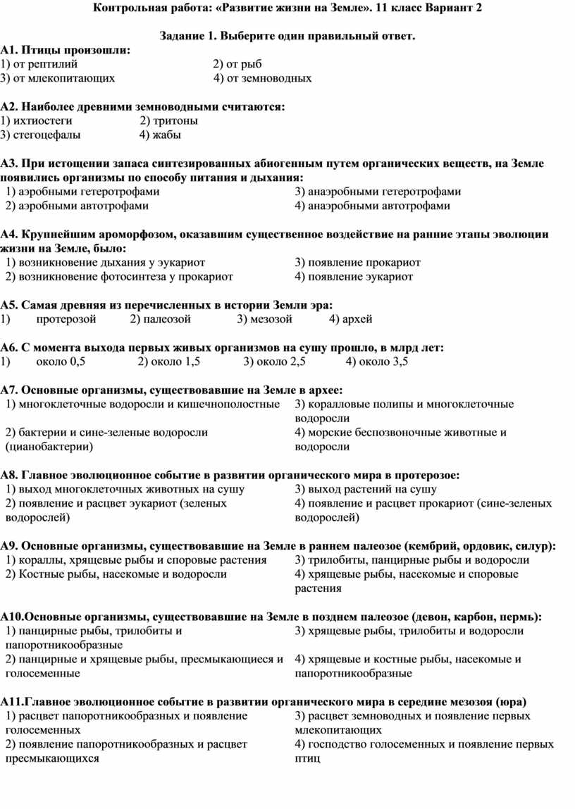 Контрольная работа: «Развитие жизни на Земле». 11 класс Вариант 2