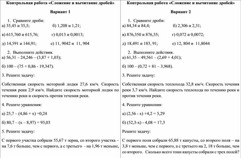 Контрольная работа «Сложение и вычитание дробей» Вариант 1 1. Сравните дроби: а) 35,45 и 35,5; б) 1,208 и 1,21; в) 615,760 и 615,76; г) 0,013 и 0,0013; д) 14,591 и 144,91; е) 11, 9042 и 11, 904 2. Выполните действия. а) 56,31 – 24,246 – (3,87 + 1,03); б) 100 – (75 + 0,86 - 19,347). 3. Решите задачу: Собственная скорость моторной лодки 27,6 км/ч. Скорость течения реки 2,9 км/ч. Найдите скорость моторной лодки по течению реки и скорость против течения реки. 4. Решите уравнения: а) 25,7 – (4,86 + х) =0,24 б) 80,7 – (х – 8,97) = 93,03 5. Решите задачу: С первого участка собрали 55,67 т зерна, со второго участка – на 7,6 т больше, чем с первого, а с третьего - на 1,96 т меньше, чем со второго. Сколько всего тонн зерна собрали с трех участков? *6. Вычислите: 11,222 – (5 – 3,95) + 2,134 + (15,95 – 6,037). *7. Решите задачу: Катер, имеющий собственную скорость 23,5 км/ч, проплыл 2 часа по течению реки и 3 часа против течения. Какое расстояние проплыл катер за все время, если скорость течения реки 2,5 км/ч? |