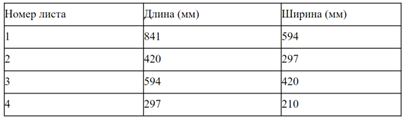 В таблице даны размеры (с точностью до мм) четырёх листов, имеющих форматы А1, А2, А3 и А4.