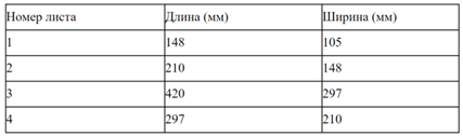 В таблице даны размеры (с точностью до мм) четырёх листов, имеющих форматы А3, А4, А5 и А6.