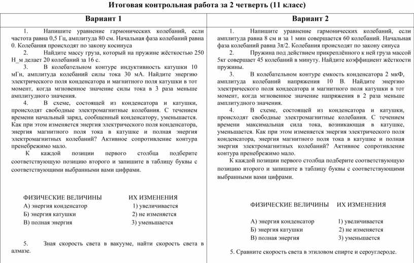 1. Напишите уравнение гармонических колебаний, если амплитуда равна 8 см и за 1 мин совершается 60 колебаний. Начальная фаза колебаний равна 3π/2. Колебания происходят по закону синуса 2. Пружина под действием прикреплённого к ней груза массой 5кг совершает 45 колебаний в минуту. Найдите коэффициент жёсткости пружины. 3. В колебательном контуре емкость конденсатора 2 мкФ, амплитуда колебаний напряжения 10 В. Найдите энергию электрического поля кондесатора и магнитного поля катушки в тот момент, когда мгновенное значение напряжения в 2 раза меньше амплитудного значения. 4. В схеме, состоящей из конденсатора и катушки, происходят свободные электромагнитные колебания. С течением времени максимальная сила тока, возникающая в катушке, уменьшается. Как при этом изменяется энергия электрического поля конденсатора, энергия магнитного поля тока в катушке и полная энергия электромагнитных колебаний? Активное сопротивление контура пренебрежимо мало. К каждой позиции первого столбца подберите соответствующую позицию второго и запишите в таблицу буквы с соответствующими выбранными вами цифрами.