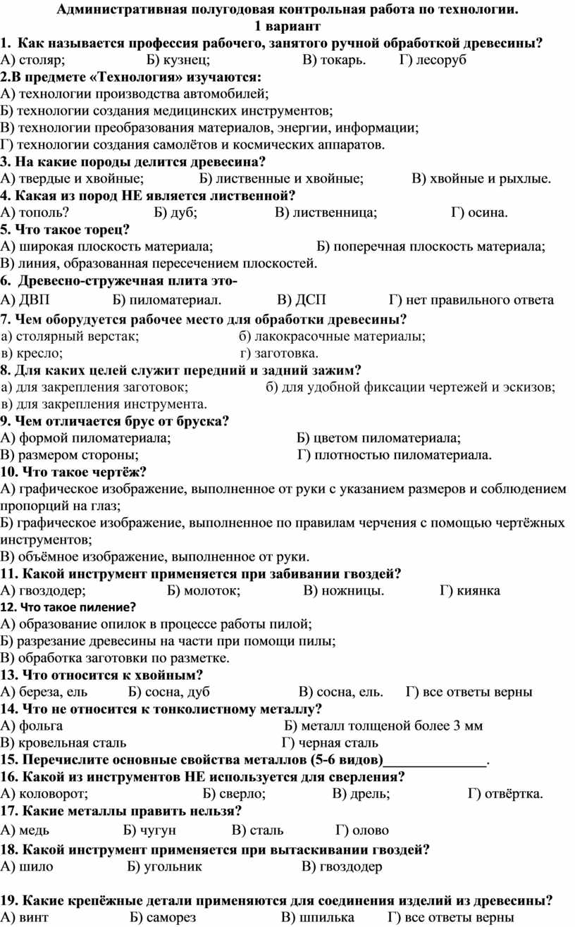 Ответы к контрольной тестовой работе по технологии5 класс, вариант для мальчиков.