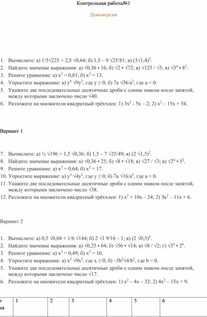 1. Вычислите: a) 0,5 √0,04 + 1/6 √144; б) 2 √1 9/16 – 1; в) (2 √0,5)2.
