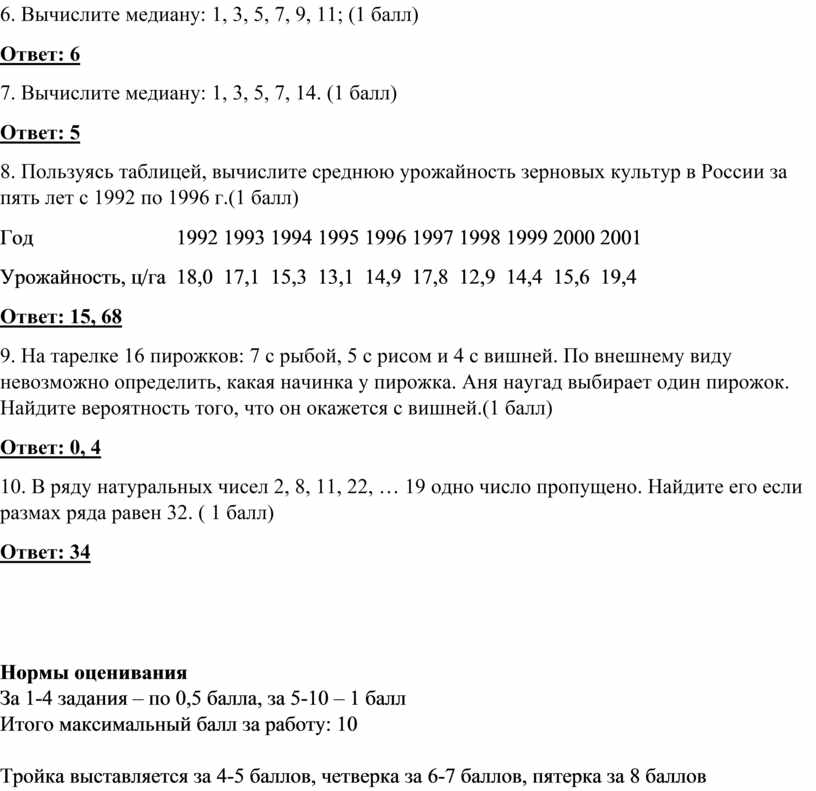 6. Вычислите медиану: 1, 3, 5, 7, 9, 11; (1 балл)