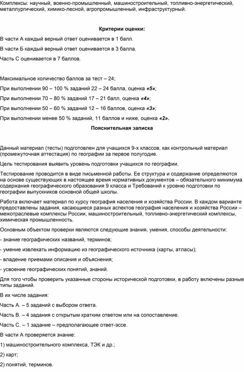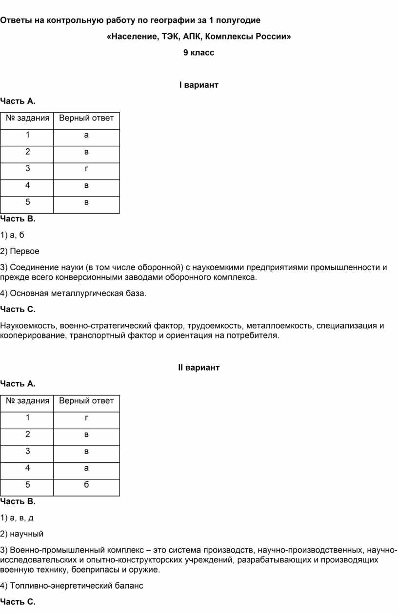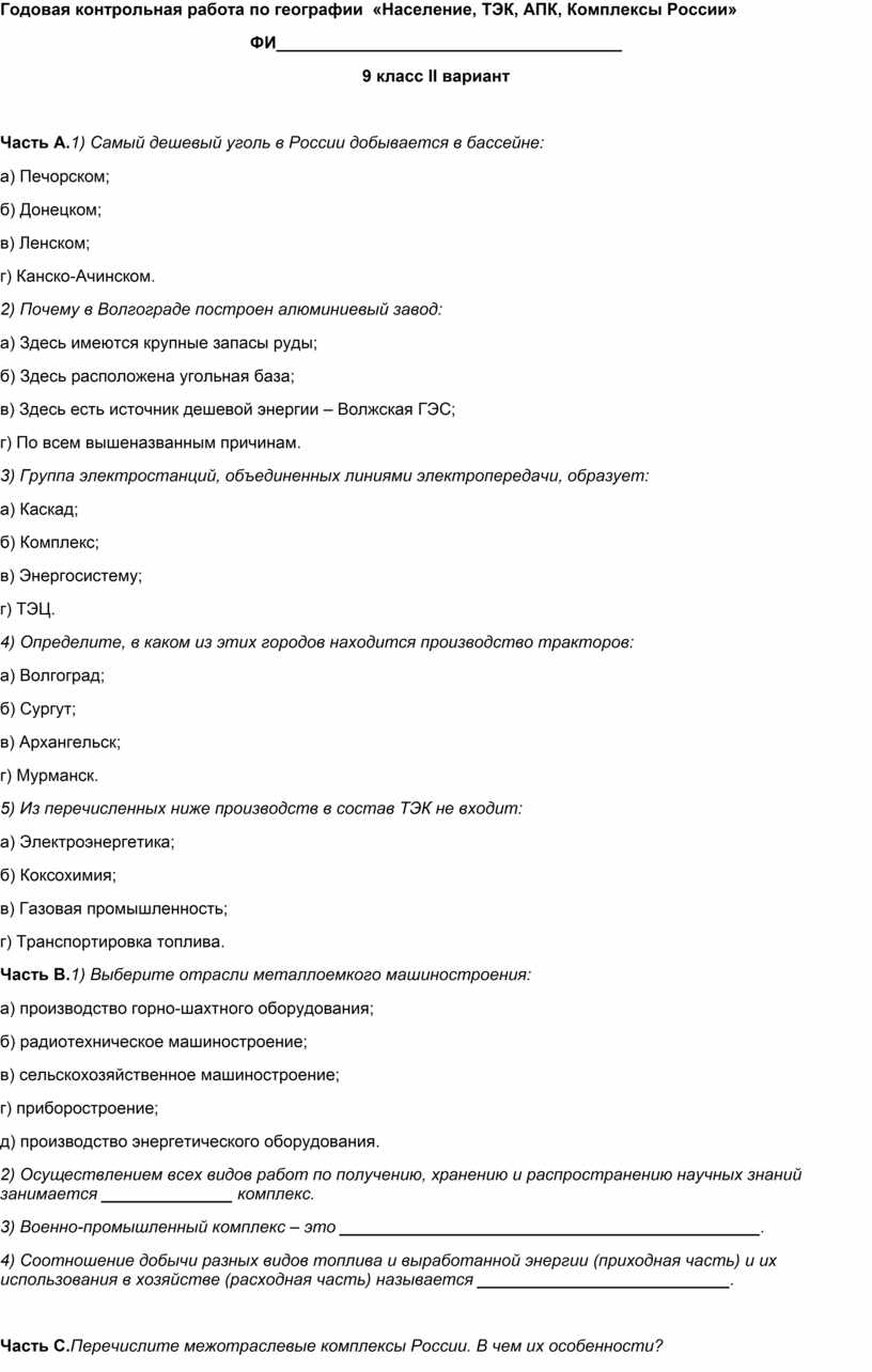 Контрольная работа по географии «Население, ТЭК, АПК, Комплексы России»