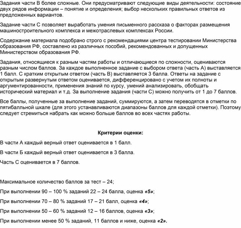 Тестирование проводится в виде письменной работы. Ее структура и содержание определяются на основе существующих в настоящее время нормативных документов – обязательного минимума содержания географического образования 9 класса и Требований к уровню подготовки по географии выпускников основной общей школы.