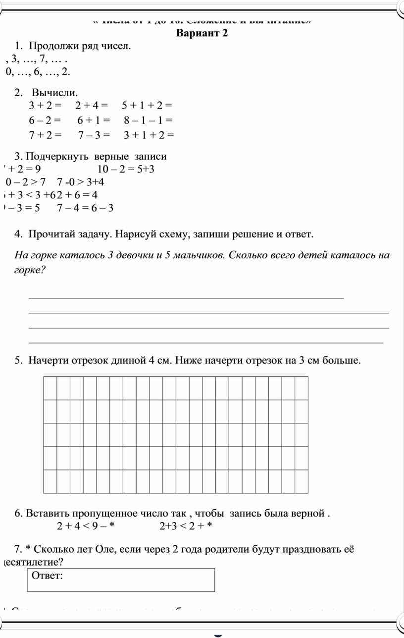 Проверочная работа по теме«Числа от 1 до 10. Сложение и вычитание»