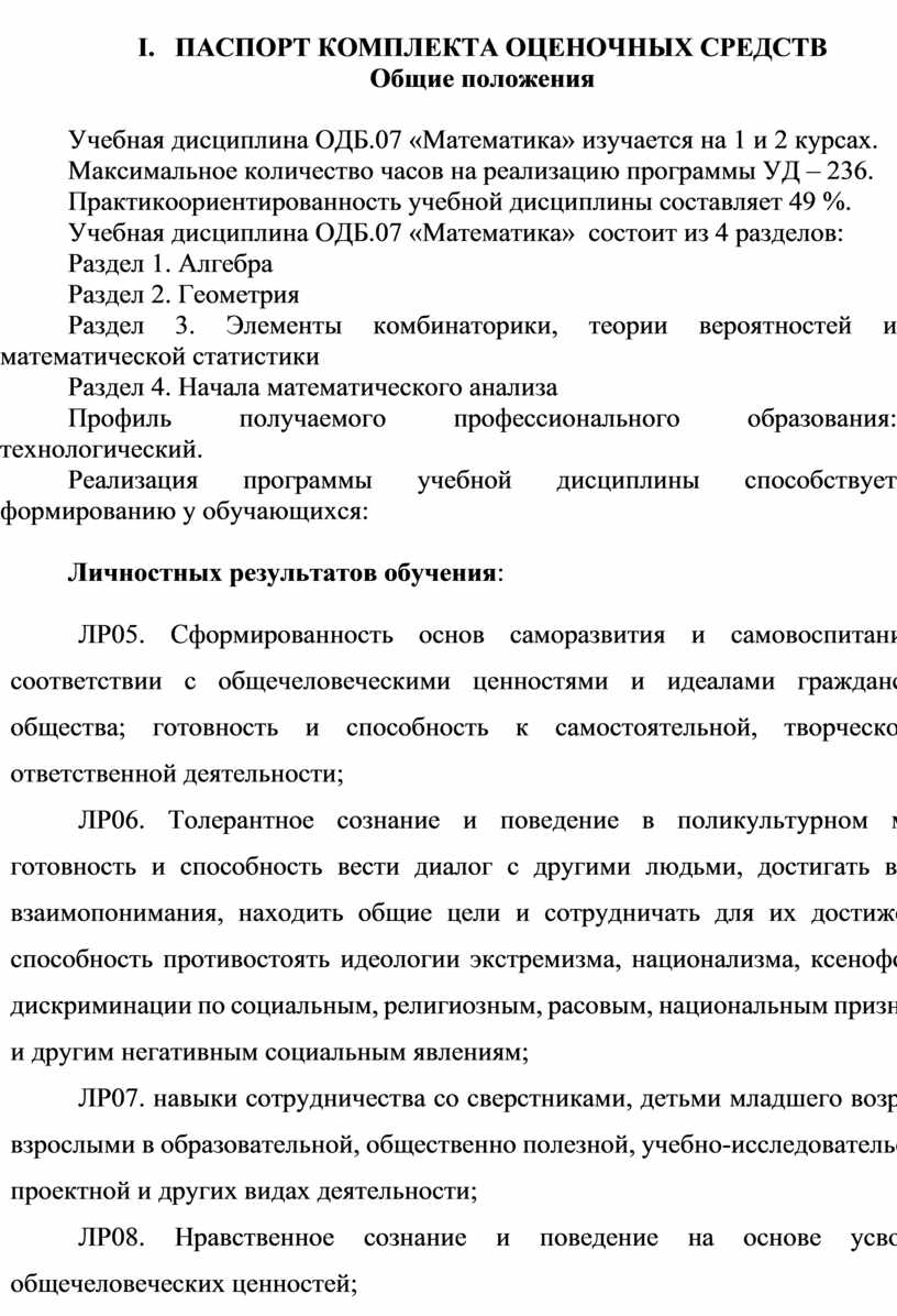 I. ПАСПОРТ КОМПЛЕКТА ОЦЕНОЧНЫХ СРЕДСТВ