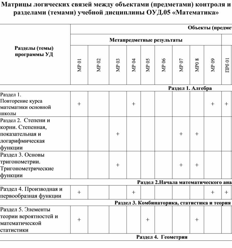Матрицы логических связей между объектами (предметами) контроля и разделами (темами) учебной дисциплины ОУД.05 «Математика»