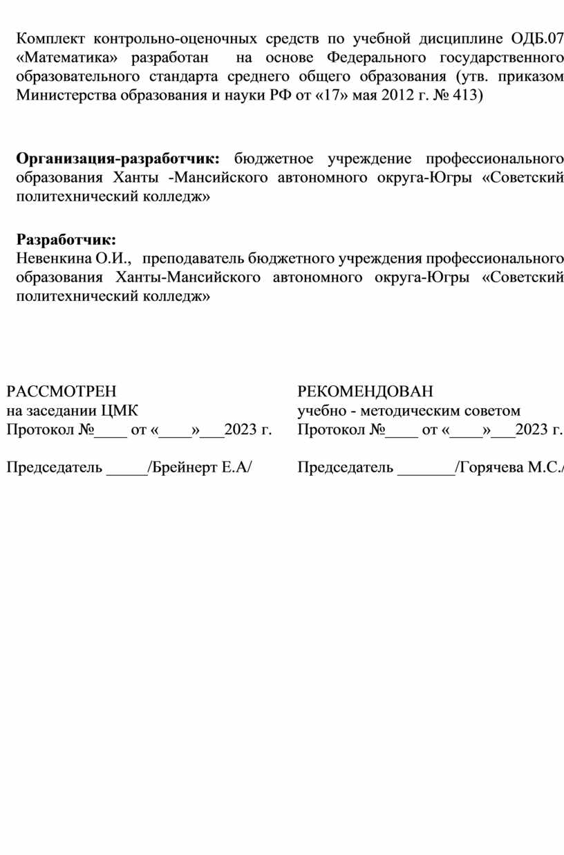 Комплект контрольно-оценочных средств по учебной дисциплине ОДБ.07 «Математика» разработан на основе Федерального государственного образовательного стандарта среднего общего образования (утв. приказом Министерства образования и науки РФ от «17» мая 2012 г. № 413)