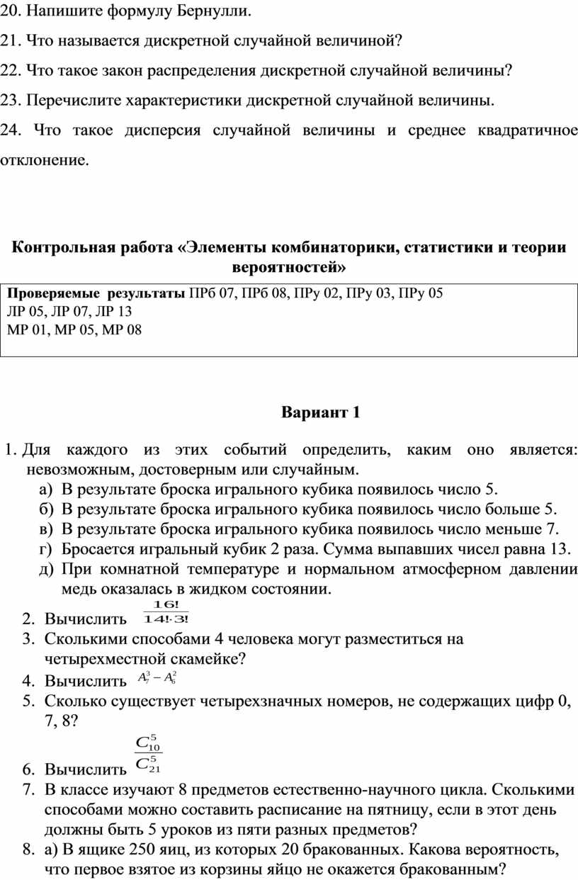 ПРу 05. Владение умениями составления вероятностных моделей по условию задачи и вычисления вероятности наступления событий, в том числе с применением формул комбинаторики и основных теорем теории вероятностей; исследования случайных величин по их распределению.